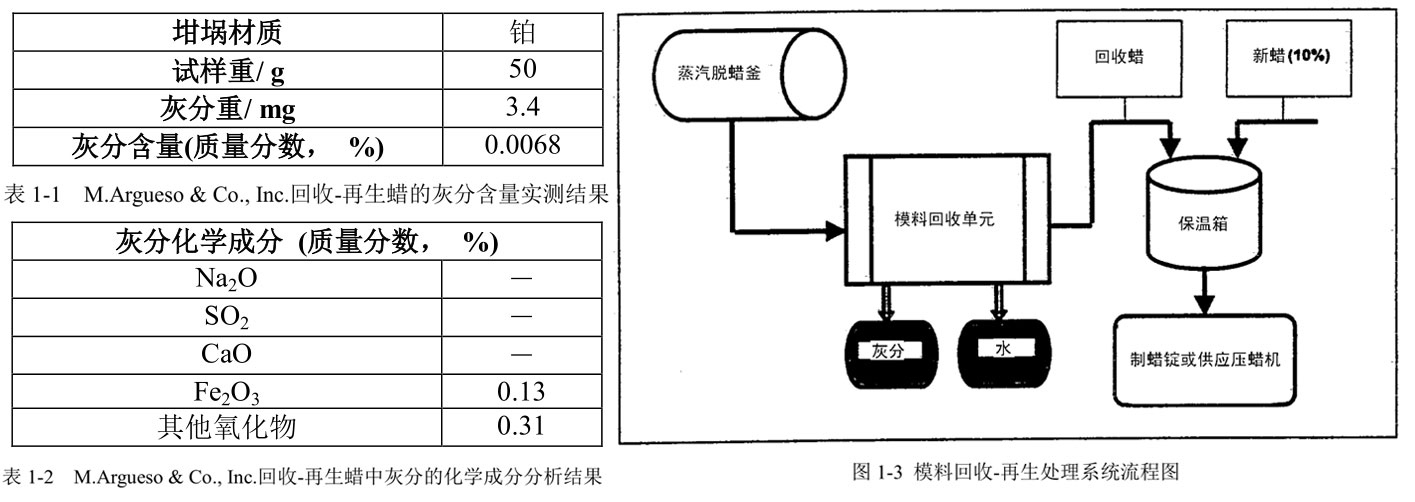 M.Argueso & Co., Inc.開發成功的專利技術 ‘Tech-Clean’ [發表于 Incast 2000 (9)], 可使回收模料中灰分含量減少 74%,達到 0.03%以下,經常保持在 0.003%~0.005%范圍 。灰分中的SiO 2 、Na 2 O、SO 2 、CaO、 Fe 2 O 3 等氧化物含量均大幅下降(表 1-2) [4] 。從而達到或接近新蠟的標準。